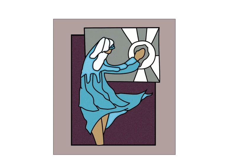 Glaskunst / Sketch. This digital illustration shows a stylized female figure in a flowing turquoise-blue dress and white head covering, reaching toward a framed circular radiant symbol. The composition is strongly inspired by stained glass and church window art, featuring…