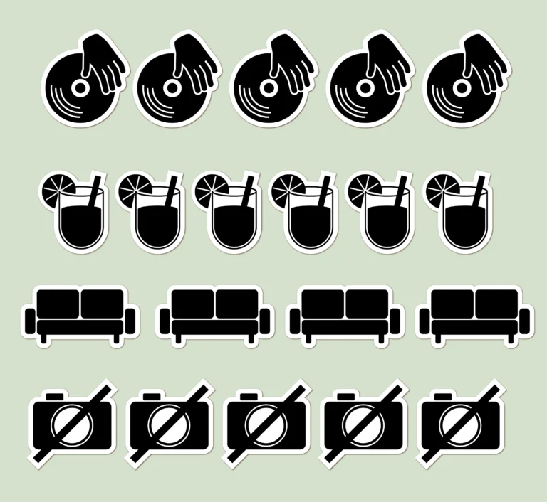 Stickers for marking areas in a club such as „DJ“ „Drinks“ „Chill Zone“ „No Photos“.