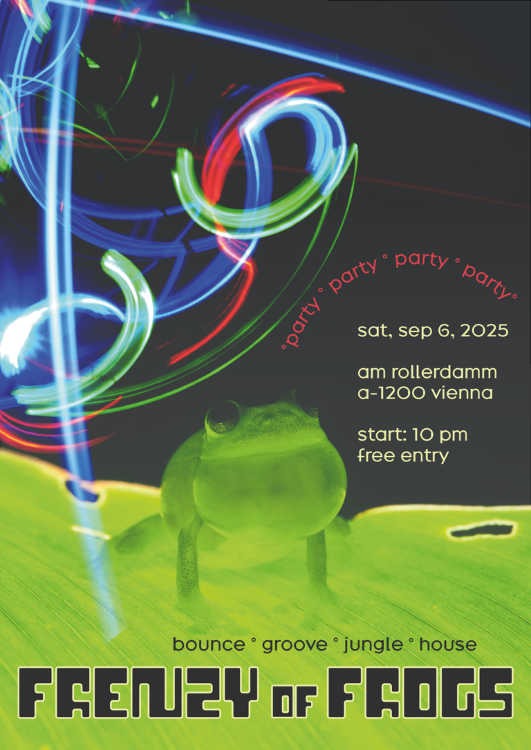 Frosch-Motiv, leuchtende Neonfarben, abstrakter Hintergrund, dynamische Linienführung, verspielte Elemente, kontrastreiche Farbpalette, auffällige Typografie, moderne Gestaltung, grafischer Stil, auffälliges Farbenspiel, futuristischer Look, pop-art-inspiriert, klare Formen, zentrale Bildkomposition, jugendlicher Stil, digitale Illustration, intensive Farbverläufe, verspielte Details, visuelle Tiefe, energiegeladene Stimmung